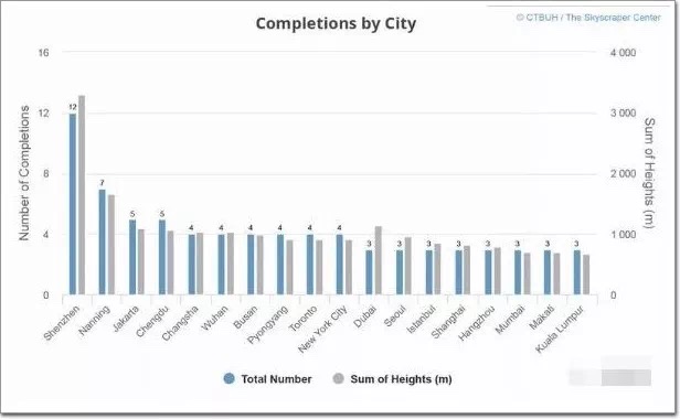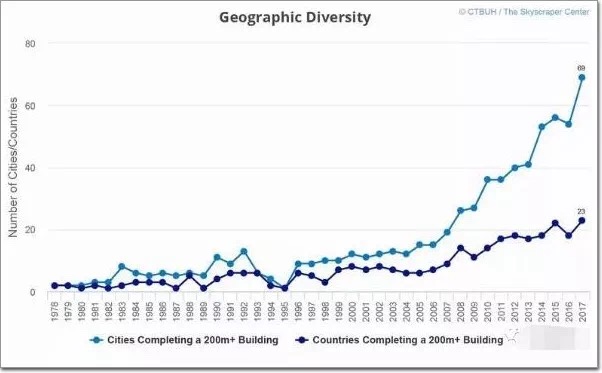 雖然地理多樣性不斷上升,中國仍然保持摩天大樓建設(shè)的世 界 領(lǐng) 先地位,完成了超過200米的新建筑的53%。事實(shí)上,今年的深圳完成了12座這樣的建筑,比其他任何一個國家都多。美國排名第二,2017年有10座新落成的摩天大樓。