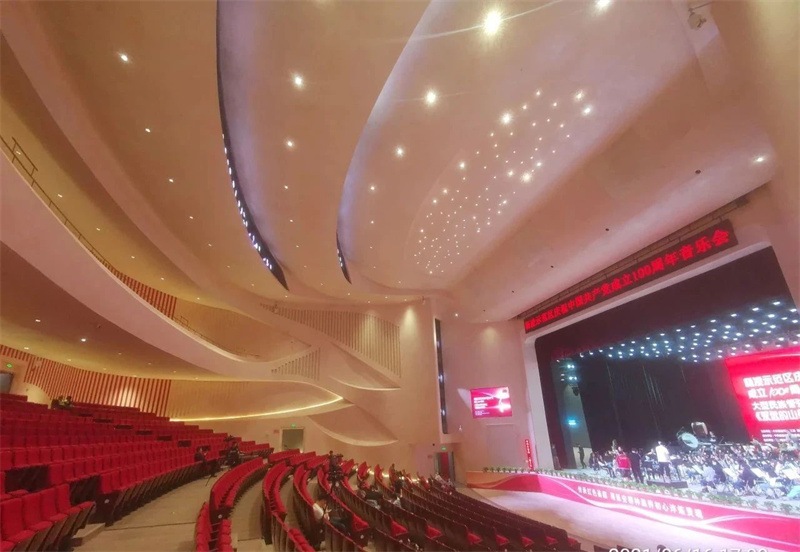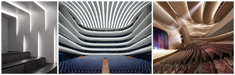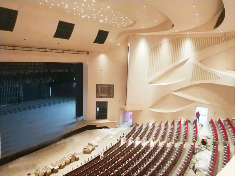 一般帶樓座和池座的劇院,樓座和池座的側墻和后墻都是用穿孔板吸收多余聲波,而我們采用了新的設計方案——GRG格柵加FGW吸音板“聚合微粒吸音板”相結合和方式,不同材質,不同顏色,不同高度,更增添了劇院的層次感。增加了劇場內聲音反射效果,以保證坐在后排的觀眾也能聽到最清晰的聲音,給觀眾帶來最好的視聽盛宴。大劇院觀眾廳墻面及頂面大面積材料均選用GRG板。它是一種特殊裝飾改良纖維石膏裝飾材料,采用預鑄式加工工藝,滿足三維曲面各種幾何形狀、鏤空花紋、浮雕圖案等藝術造型,造型的隨意性,使其成為要求個性化建筑師的首選,它獨特的材料構成方式足以抵御外部環境造成的破損、變形和開裂, 具有良好的聲學特性。
