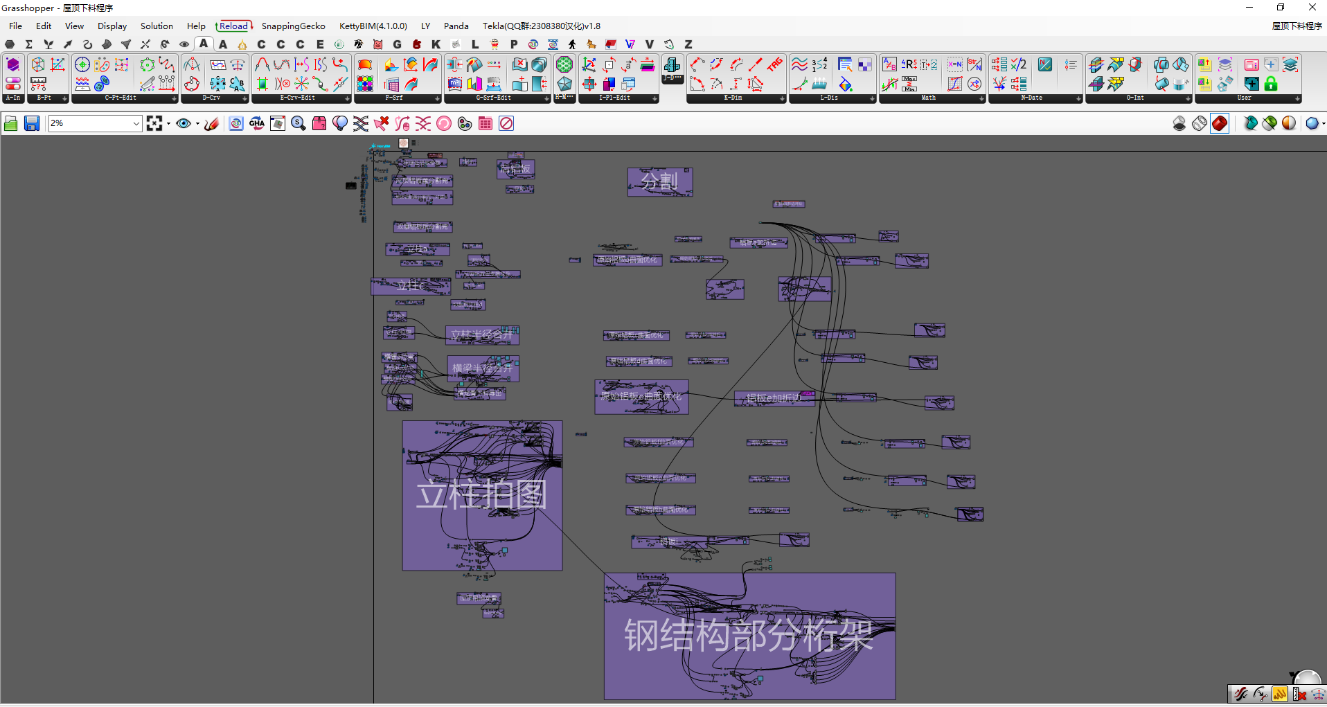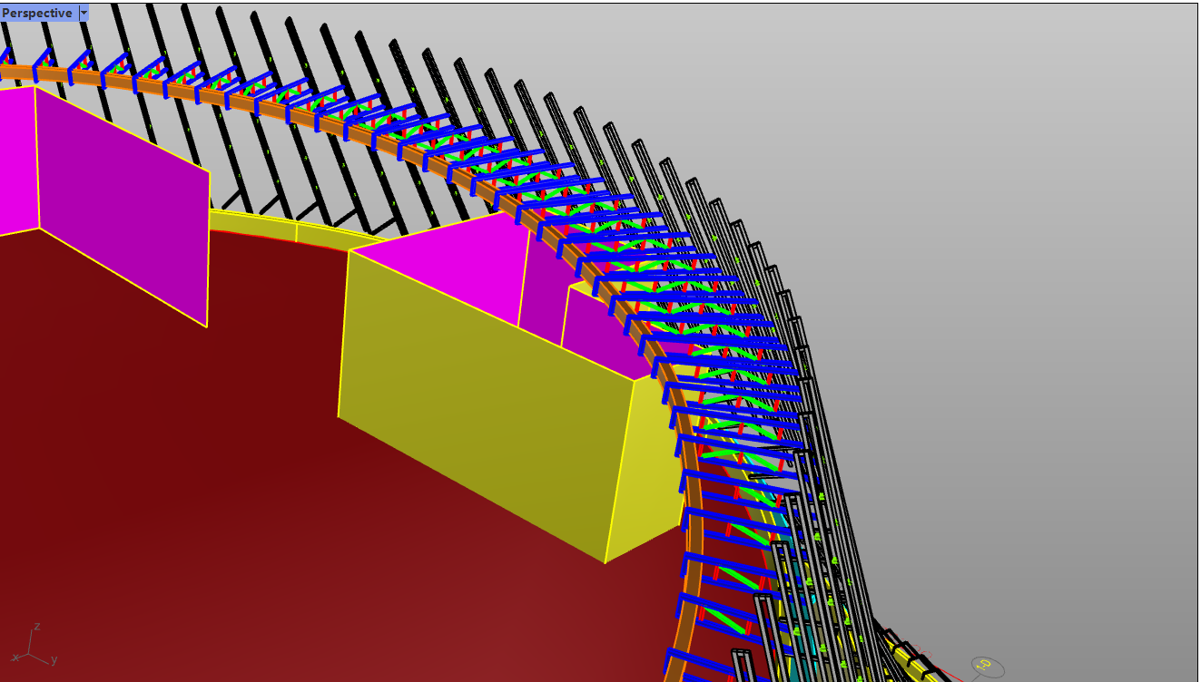 本項目鋁板造型多、曲面鋁板占比大,施工工藝復雜,對現場施工措施要求極高,現場需要大量曲臂車及其他特殊設備進行配合,本項目使用吊籃大部分為特殊加工定制,安裝難度較高,項目部同專業廠家加班加點定制方案,最終一次性通過專家論證,為項目的順利實施提供保障。施工過程中,我們的項目團隊根據現場情況和設計團隊不斷溝通,不斷地試驗,參考公司其他體育場館建設方案和團隊自身技術經驗,最終完美地將這些節點一一落實到位。在施工下料階段,全程采用Rhino+Grasshopper 平臺結合編寫的幕墻自動化下料系統,根據分格尺寸進行平板、單雙曲優化,在合理的誤差范圍擬合原G2曲面,板材進行扣縫、折邊、開缺,完成加工模型,自動與Excel對接,生成材料清單,并將所需面板、編號、面積、材質、圖號等加工數據信息自動輸入。幕墻雙曲龍骨經優化后模型與圖紙誤差控制1mm左右,全參數化自動生成圖形、尺寸標注、參數,保證圖紙準確無誤;每一榀龍骨在安裝過程中嚴格根據全站儀點位進行三維空間定位,模型空間與實際空間1:1還原。