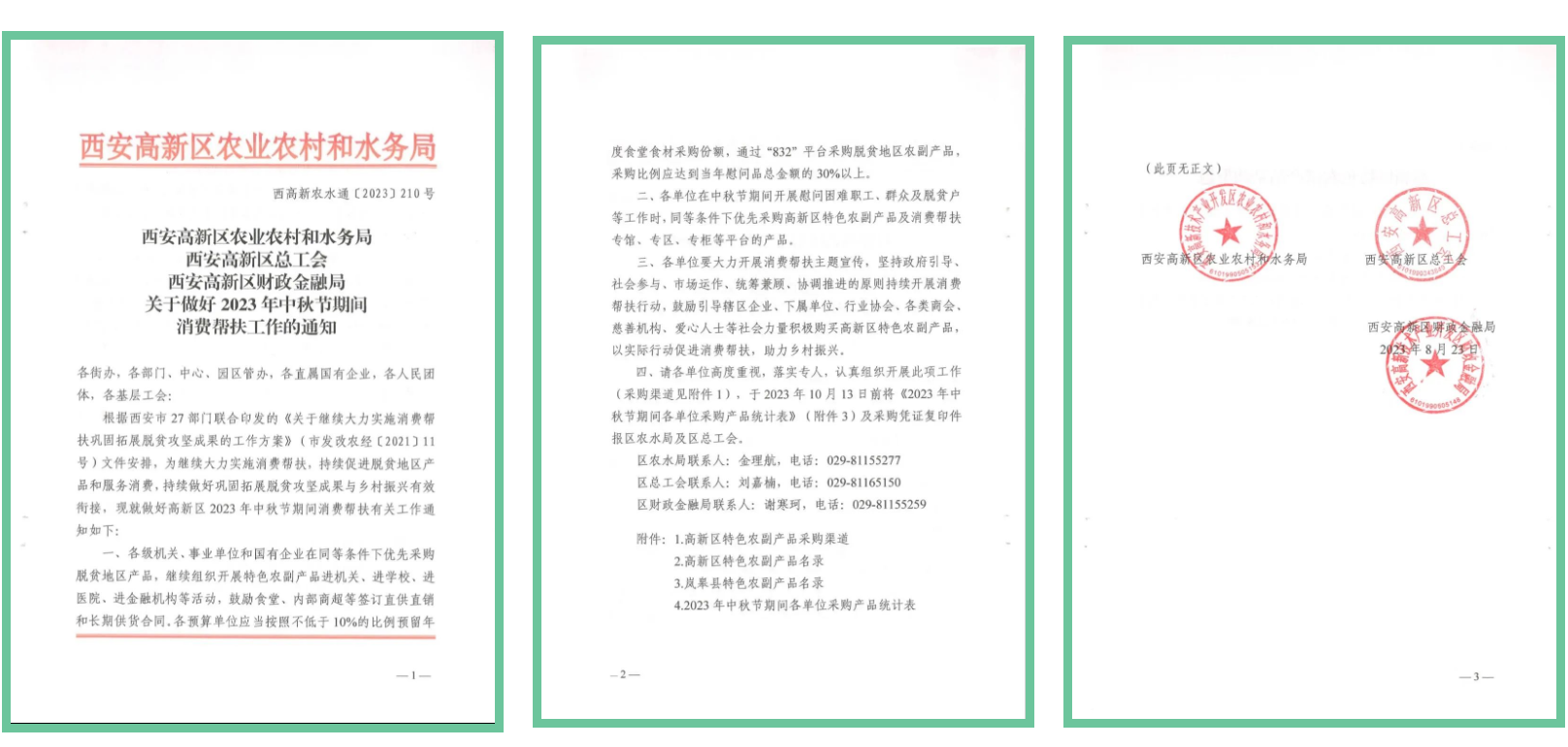 2023年8月23日,西安高新區農業農村和水務局、西安高新區總工會、西安高新區財政金融局發布關于做好2023年中秋節期間消費幫扶工作的通知。鼓勵各單位、各企業在同等條件下優先采購脫貧地區產品,組織開展特色農副產品進機關、進醫院、進各大機構等活動。要求各單位大力開展。消費幫扶主題宣傳。