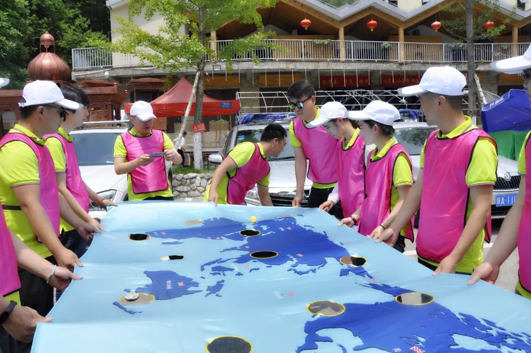 團(tuán)隊(duì)成員必須雙手拉地圖邊緣,球必須穿過地圖上的七大洲四大洋,按照指定的路線,到達(dá)指定的終點(diǎn)項(xiàng)目挑戰(zhàn)成功。