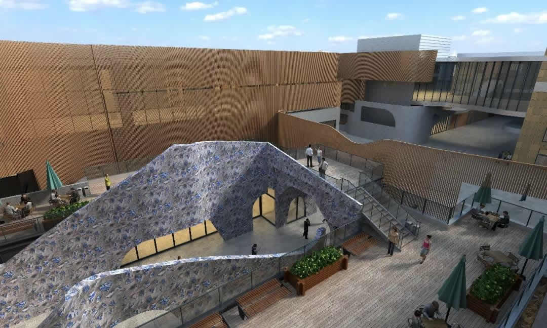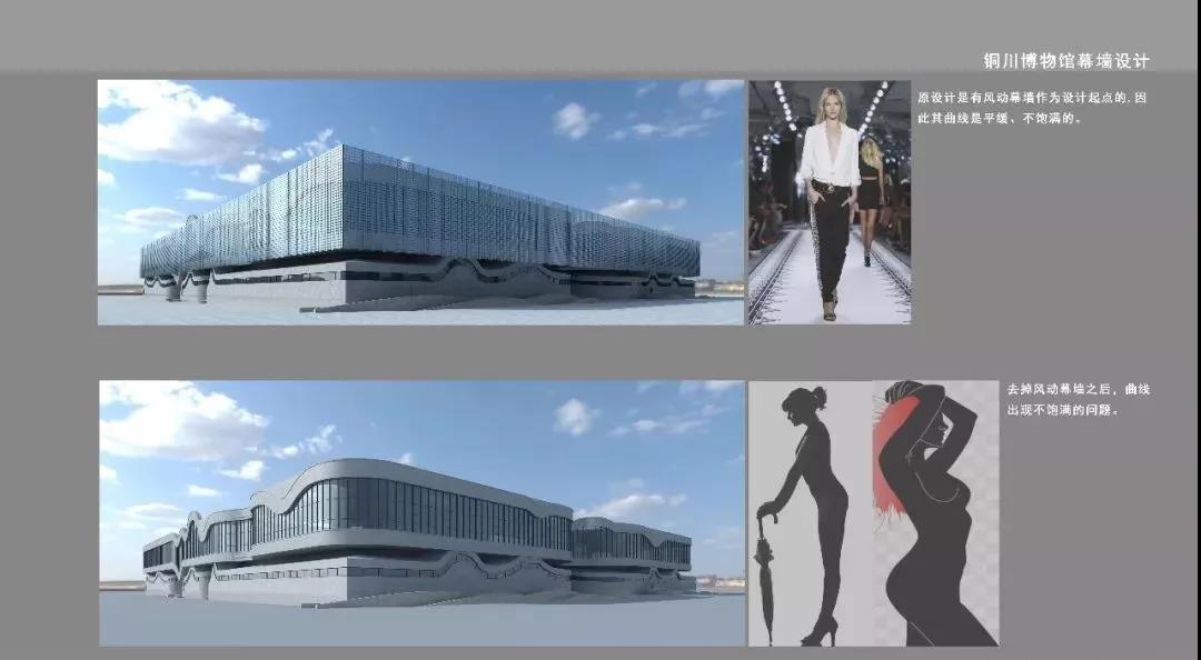 本建筑外立面主體設計以凸顯銅川的青山、綠水,宣揚銅川的工業文明為基本理念,主體結構以山為設計元素,高低有致,起伏連綿的建筑形體勾勒出了復雜各異的幕墻形式。其幕墻形式主要有風動金屬幕墻、形態各異的玻璃幕墻、雙曲面鋁單板幕墻、噴涂藝術混凝土墻、干掛藝術混泥土幕墻、干掛噴涂藝術混凝土幕墻、陶土板幕墻、防腐木飾面墻、鏤空陶磚墻、異形陶棍幕墻、雙曲面玻璃采光頂、光伏發電幕墻、異形鋁單板雨棚、濕貼陶磚墻、濕貼瓷片墻、干掛濕貼瓷片墻、石材幕墻、鋁合金門窗、鋁合金裝飾線條、玻璃雨棚、玻璃欄桿等幕墻形成。整個項目的幕墻形式可謂包羅萬象,形態各異。有些幕墻形式及構造屬于行業首創并已申報國家專利。豐富的幕墻是形式意在展示銅川的水泥、水泥配料黃土、陶瓷、耐火黏土、磚瓦等工業成果!