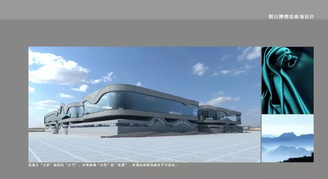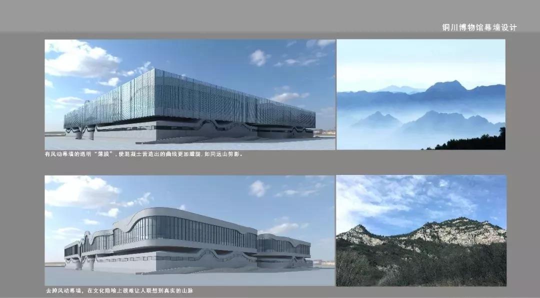 通過可以在空中隨風飄舞的風動幕墻形成水波效果,與起伏連綿山的建筑構造相結合,形成山水呼應、若隱若現的山水景象,也寓意著銅川滄海桑田的變化和發展景象,使得新技術、新工藝的現代幕墻與博物館建筑從歷史文脈及建筑形體上結合的更加緊密自然。
