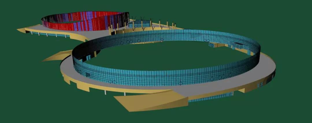 陜西奧體中心體育館項目幕墻工程包括半隱框玻璃幕墻,隱框幕墻,鋁板幕墻,電動天窗,車道雨棚等子項。其中,玻璃幕墻分為豎明橫隱玻璃幕墻、豎隱橫明玻璃幕墻、隱框玻璃幕墻;建筑多為曲面,定位復雜,幕墻立面與球形屋面交接部位高低起伏大且非規則形狀;屋面網架結構跨度較大,風壓作用變形對立面幕墻影響大;曲線形狀且平面尺度大、收邊收口多。