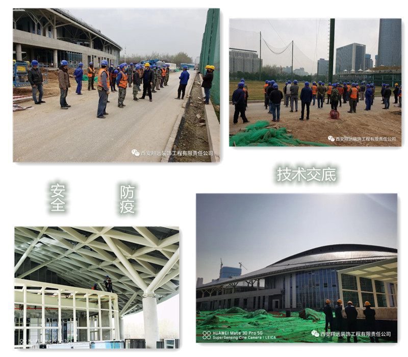 疫情期間,為確保陜西奧體中心體育館順利按期交付使用,我司在項目申請復工批準后,迅速組織落實勞務班組、材料、機械、設備等,項目管理人員于2020年2月24日到達現場,多措施組織勞務施工人員準時到達施工現場,多方協調材料供貨廠家、加工廠,確保材料及時供應和現場施工有序進行,并采購充足防疫物資,確保現場防護及施工安全。